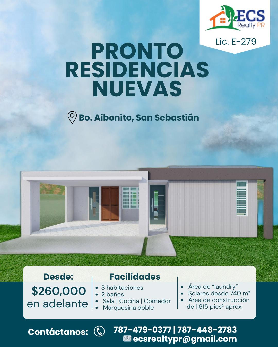 🏡 ¡RESIDENCIAS NUEVAS EN SAN SEBASTIÁN! Ubicadas en Bo. Aibonito, este nuevo proyecto te ofrece el hogar que siempre soñaste: ✨ 3 habitaciones | 2 baños 🛋️ Sala | 🍽️ Comedor | 👩🍳 Cocina 🚗 Marquesina doble 🧺 Área de laundry 🌿 Solares desde 740 m² 🏠 1,615 pies² de construcción aprox. 💵 Desde $260,000 […]